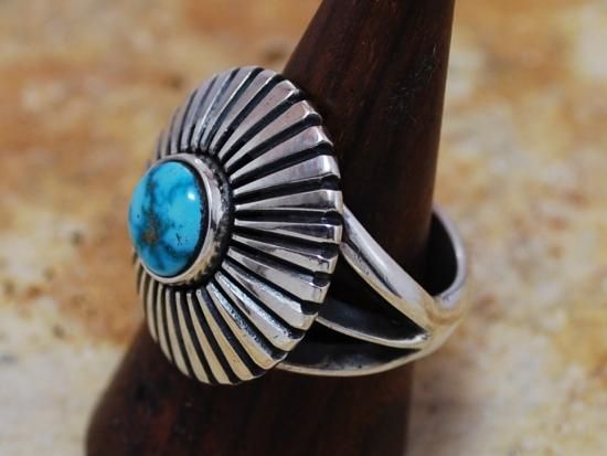中心にターコイズを配置して、オーバーレイ技法を用いてサンバーストを表現しています。正確で細かい仕事が見て取れます。シンプルですが、とても存在感のあるリングです。