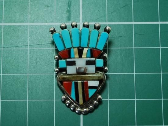 数種類の石を配置したカチナモチーフのペンダントはインレイというズニ族の特徴ともいえる技法で作られた作品です。