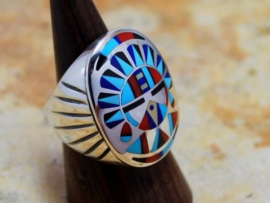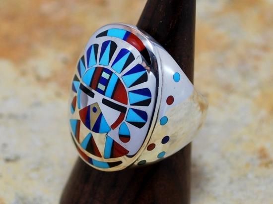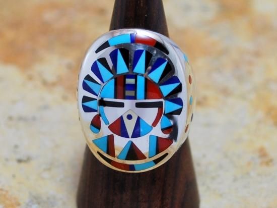シルバーと石の複雑なカットを巧みに組み合わせたインレイという技法でサンフェイスを表しています。